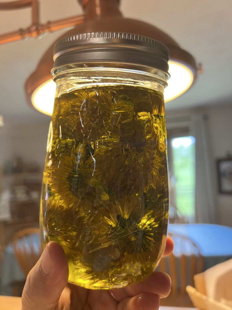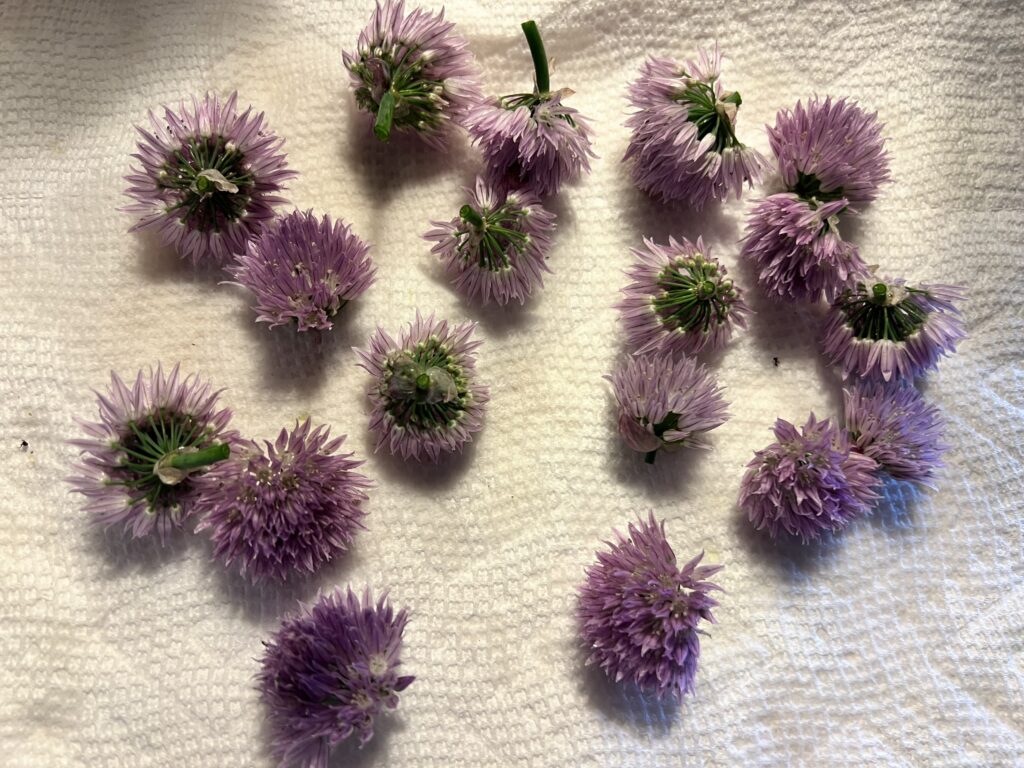 Next I took a try at an olive oil infusion with chive blossoms from my herb garden.